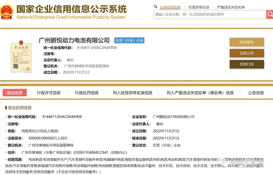去年年底,小鹏注册了广州鹏悦动力电池有限公司,经营范围包括电池制造、电池零配件生产以及电机制造等。