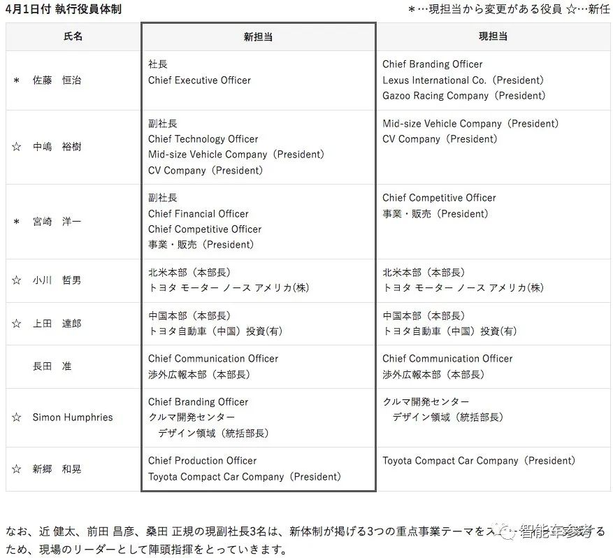 自今年4月1日起,公司总裁中岛裕树将出任首席技术官,宫崎洋一将任首席财务官,西蒙·汉弗莱斯出任首席品牌官,并且三人将加入董事会,共同负责BEV改革、Woven计划以及亚洲碳中和战略。