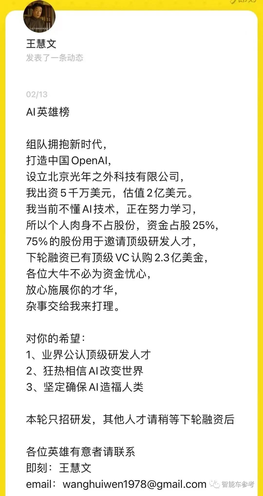 这不,理想汽车的投资人、美团联合创始人王慧文,被ChatGPT震撼后,决定自掏5000万美元入场,新公司估值超过2亿美元,而且这还只是开始,这公司才注册,已经有顶级VC承诺提供2.3亿美元的下一轮了,估值轻松过10亿美元。