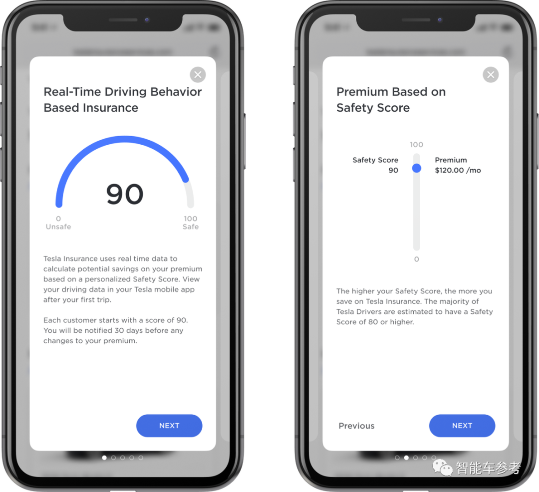 特斯拉采用安全评分、车型、险种、区域、行驶里程等作为定价因子。一般来说,所有新注册的用户默认安全评分为90分,你的分数越高,保费就越低。