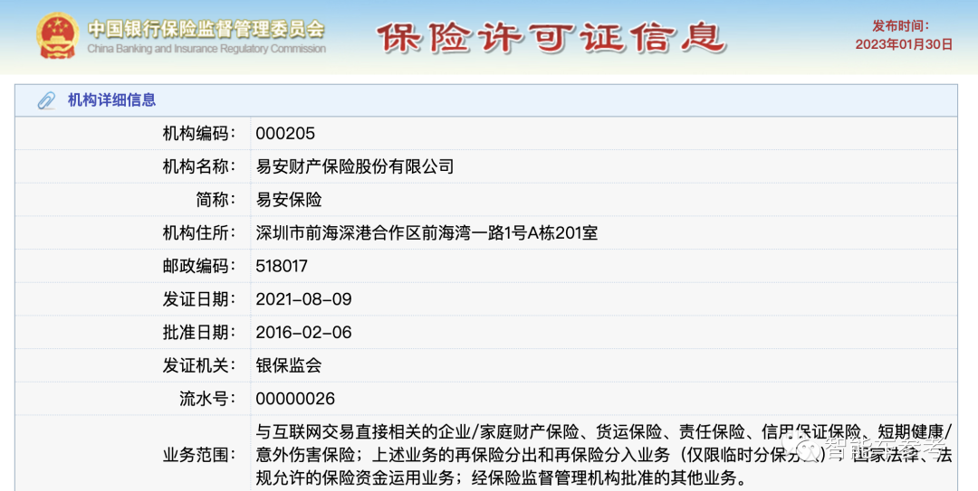 公开资料显示,易安保险经营范围为企业/家庭财产保险、货运保险、责任保险、信用保证保险、短期健康/意外伤害保险等,并不包括车险业务。