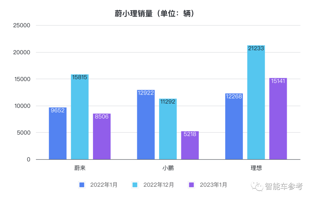 其中蔚小理三家今年1月销量分别同比下降了11.9%、59.6%和23.4%。