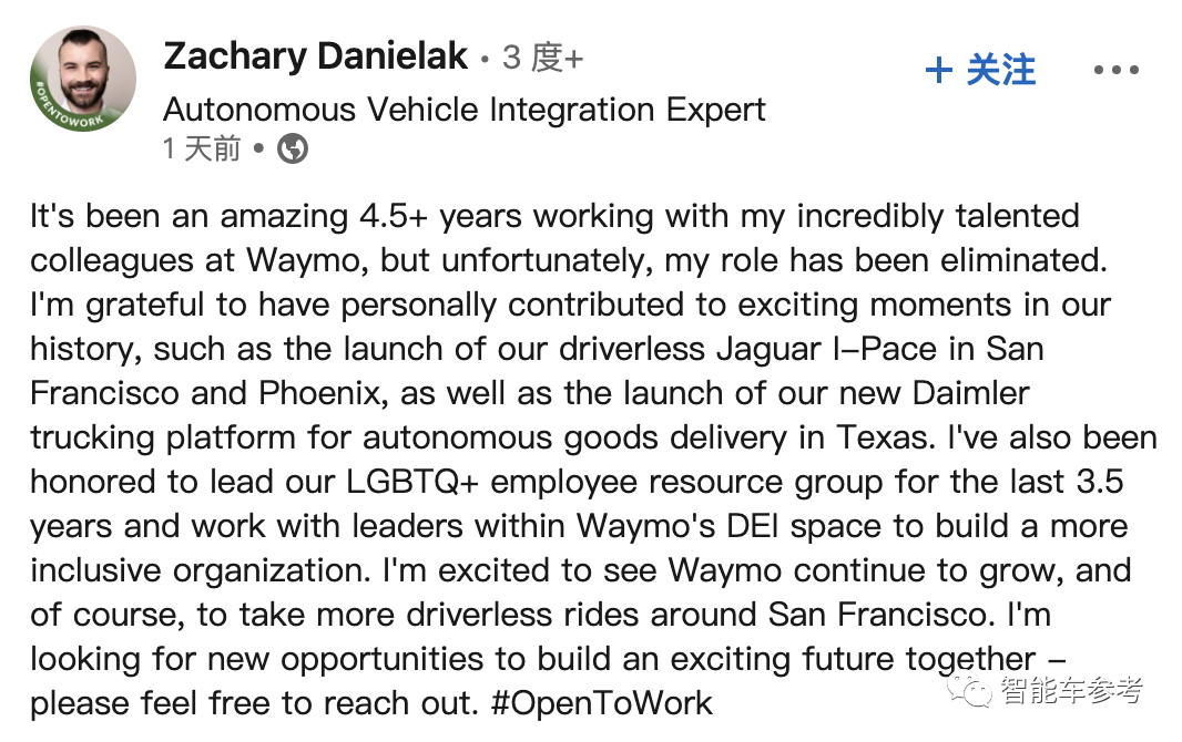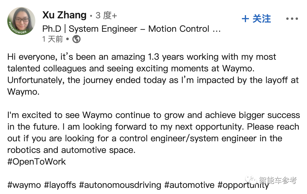 不完整统计,已有10位Waymo员工在领英上发帖,遗憾表达自己被辞退的消息。