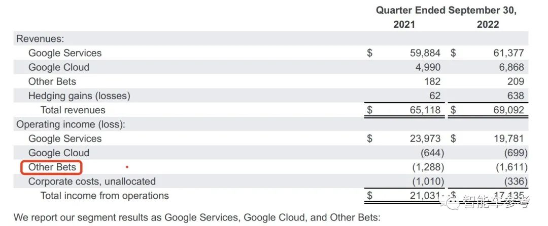 Alphabet公司财报也能佐证:2022年第三季度净收入139.1亿美元,同比下降了27%;“其他赌注”运营亏损为16亿美元,相比2021年同期的12.9亿美元上涨了24%。