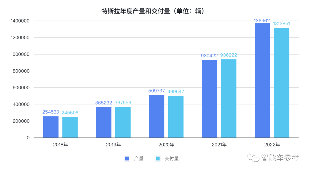 2022年,特斯拉共生产1369611辆,同比增长47%;共交付1313851辆,同比增长40%。