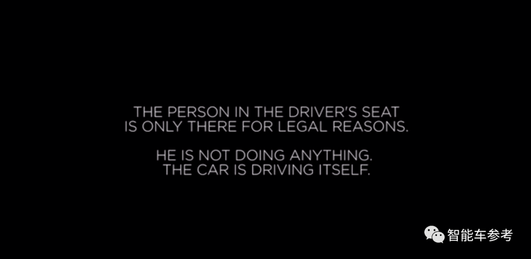 视频一开头车还没出场,黑底白字正告:“视频中驾驶员仅因为法规要求坐在驾驶位,他全程没有操作汽车,特斯拉自己驾驶自己”。