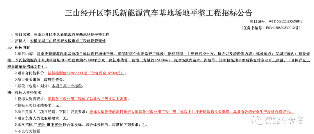让这种猜测更加真实的是一则官方公告——把“李氏新能源汽车基地”带到了聚光灯下。