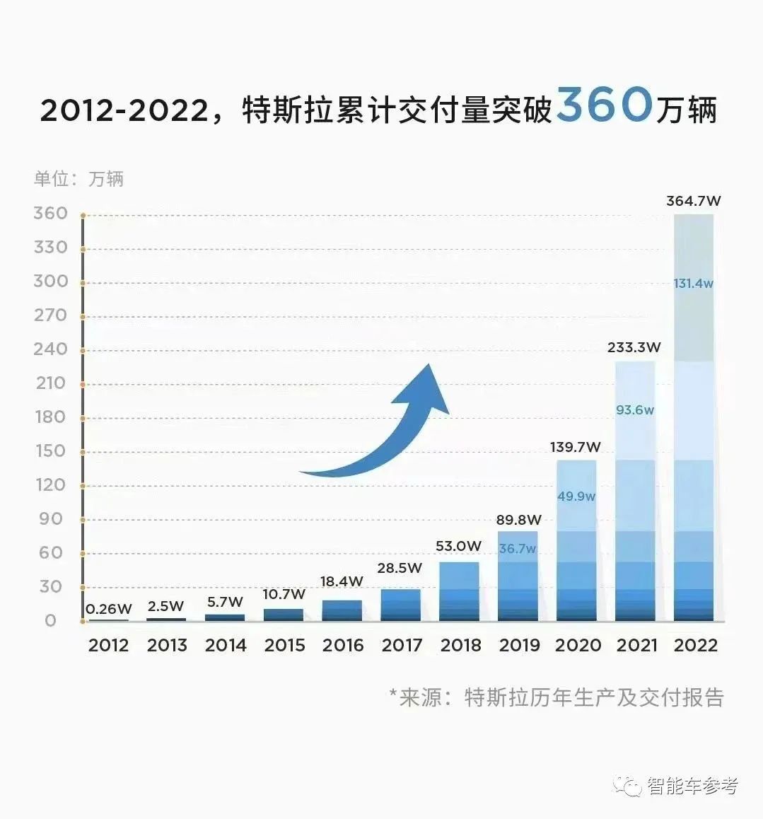 公开数据显示,从2012到2022年,特斯拉累计交付量已经突破了360万辆。