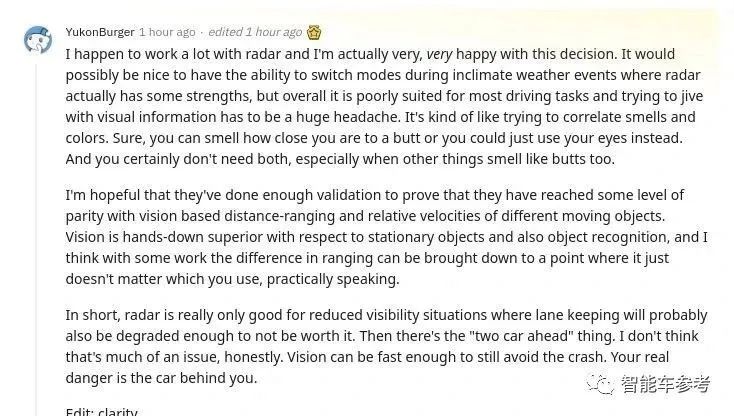 这段评论的大意是,雷达感知确实在特殊天气下有优势,不过总体来讲,大多数驾驶场景下没啥用,还会因为增加冗余带来数据处理的麻烦。