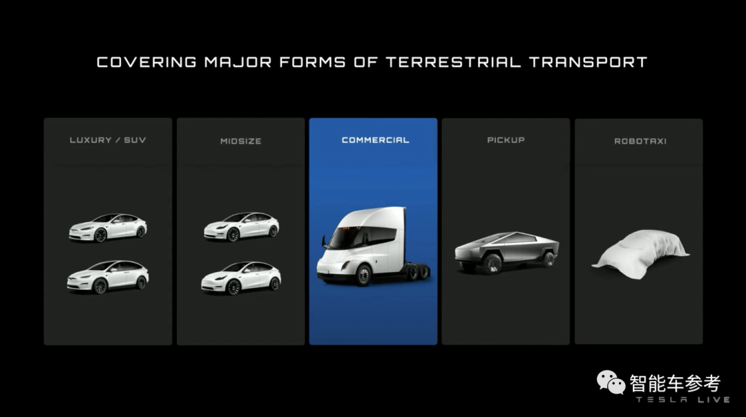 陆地上跑的,不仅有ModelX/S、3/Y,现在则多了商用卡车Semi,未来还有皮卡和Robotaxi会相继问世。