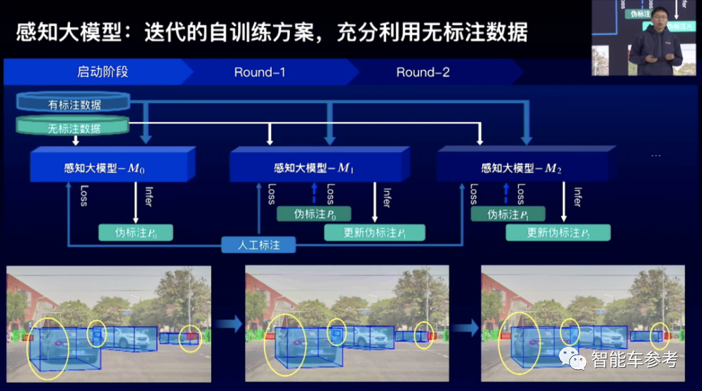 具体方法是采用迭代的自训练方案。首先在既有2D又有3D的训练数据上,去训练一个感知大模型出来,然后给没有3D标注数据打上3D伪标注。再继续训练一个感知大模型出来,如此迭代,逐步把感知大模型效果提升,同时也使得3D的尾标注的效果越来越好。