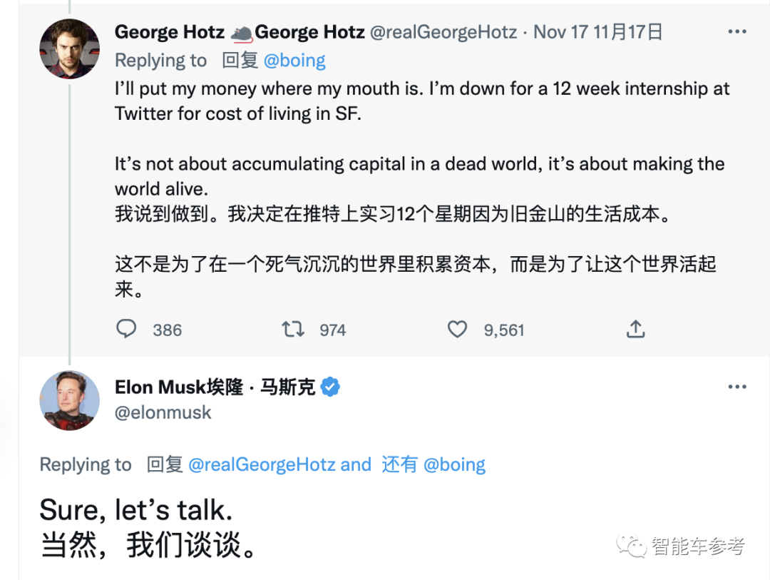与此同时,上周霍兹宣布加入推特,打算在这实习12周,马斯克热情答应了。