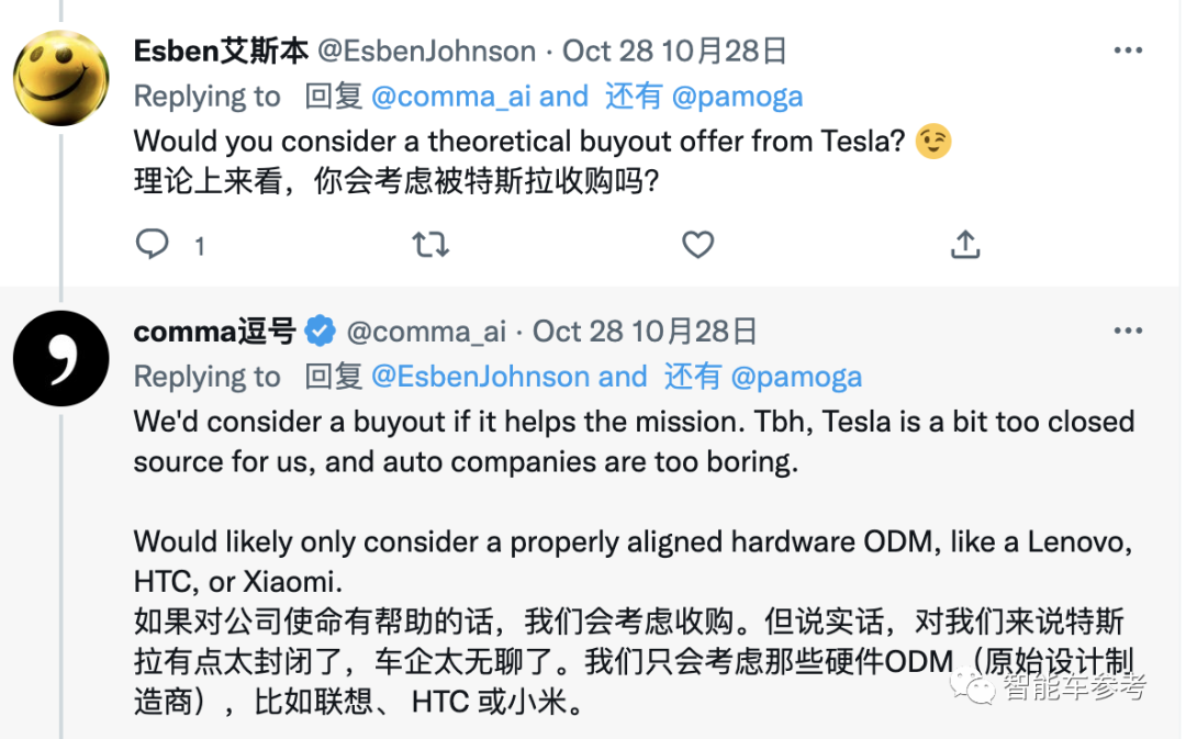 更有趣的是,最近自动驾驶界噩耗频传,Comma.ai却表示不愿意被特斯拉收购: