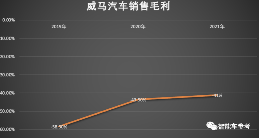 销售毛利上,威马依然没有转正,2021年度为-41.1%,按照威马单车均价18-20万计算,平均每卖一辆车,仍然要亏损1.8万元。