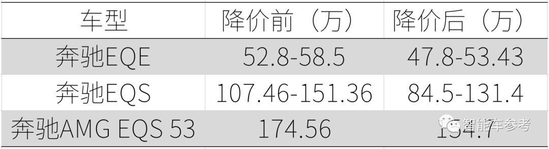 从折扣力度来看,原本售价高的两款车型降幅较大,例如EQS起售价降低了22.96万元,而EQE仅下降5万元左右。