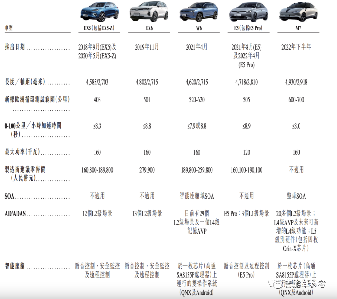 威马在售车型有4款,SUV包括EX5、EX6、W6、轿车E5,都是轴距在2.7-2.8米的紧凑中型车。