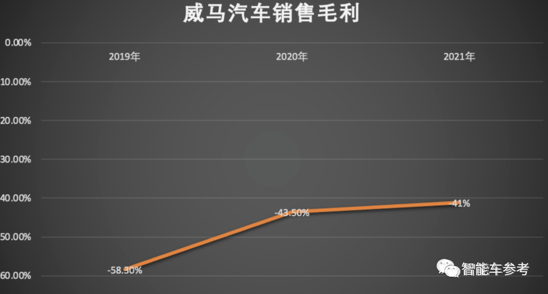 销售毛利上,威马依然没有转正,2021年度为-41.1%,按照威马单车均价18-20万计算,平均每卖一辆车,仍然要亏损1.8万元。