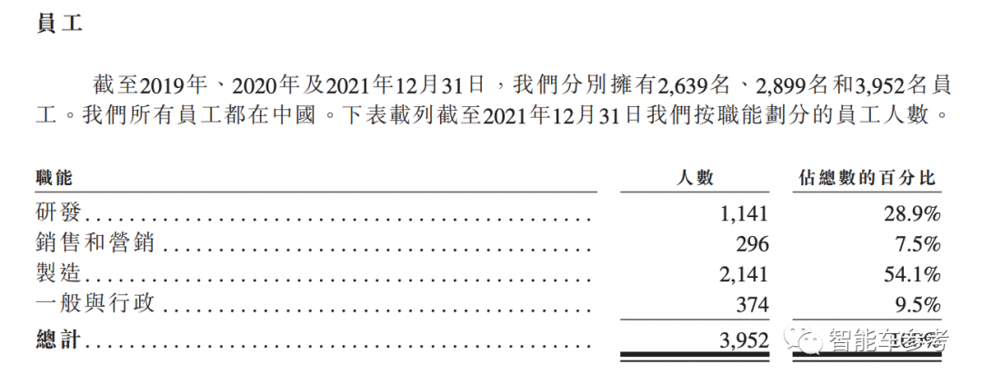 2021年底,威马员工总数为3952人,比2020年底增加超过1/3,而且制造与研发人员比重最大,分别是54.1%和28.9%。