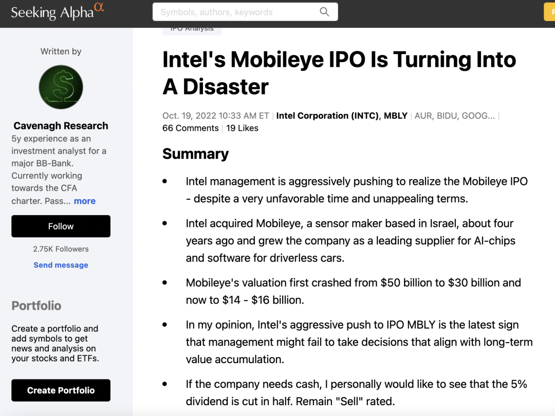 比如,北美影响力很大的独立金融观察平台Seeking Alpha认为,英特尔强推Mobileye上市,“除了变成一场灾难,还反映出英特尔管理层的决策缺陷”。