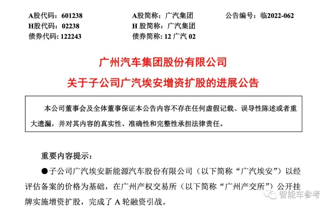 最新消息称,广汽埃安以公开挂牌的方式实施增资扩股,完成了A轮融资。