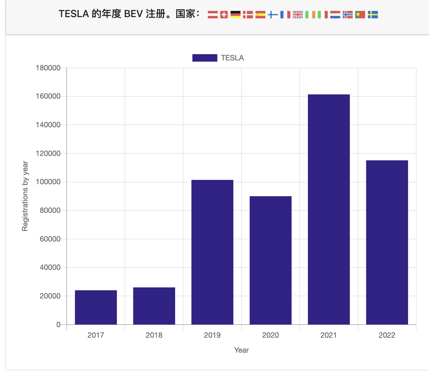 根据EU-EVs网站的数据,2017年,特斯拉在欧洲14个国家的注册量超过两万,2018年略有上涨,到了2019年就已突破10万辆大关。虽然2020年因为疫情有所下降,但2021年特斯拉注册量超过了16万。其中在德国,特斯拉从2019年-2021年的年度注册量分别超过了1万,1.5万和3.5万。
