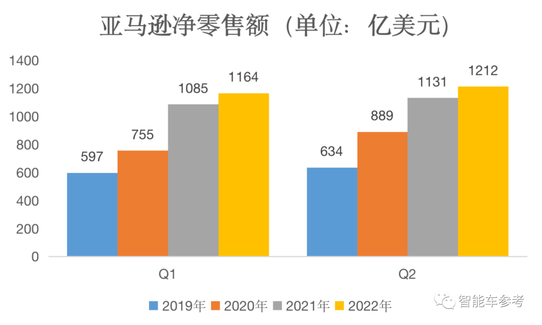 财报数据显示,今年Q1亚马逊净零售额为1164亿美元,同比增长7%;今年Q2净零售额为1212亿美元,同比增长还是7%。
