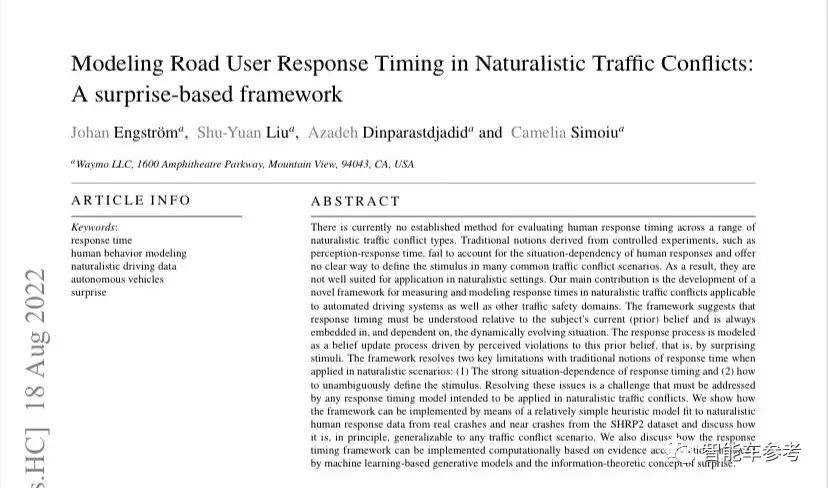 Waymo的贡献之一在于,他们研究出了一种全新架构模型——以此来对真实道路环境下的司机反应时间进行测量和建模。