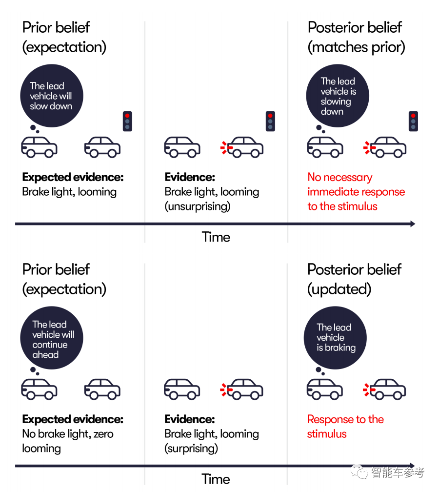 图中下半部分,司机原以为前车要继续前行,然而事实是前车突然刹车,这就与他的心理预期不相符合,认知也就出现了迭代更新。