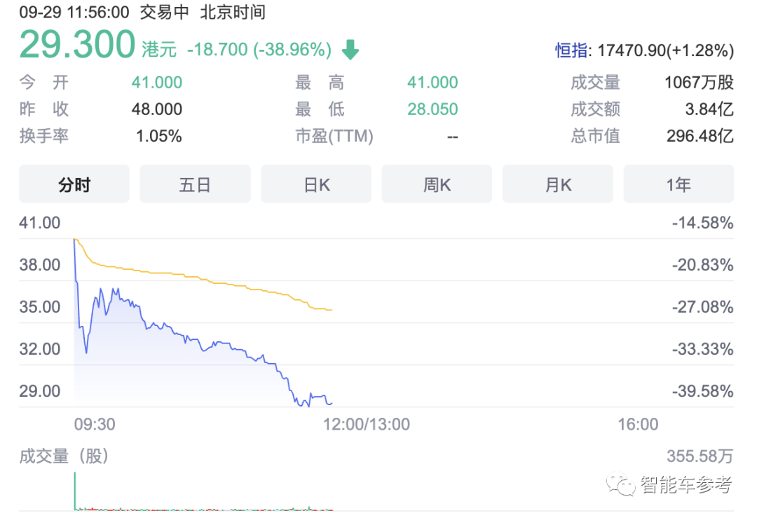 随后跌幅一度扩大至近40%,截止发稿,零跑股价为29.3港元。
