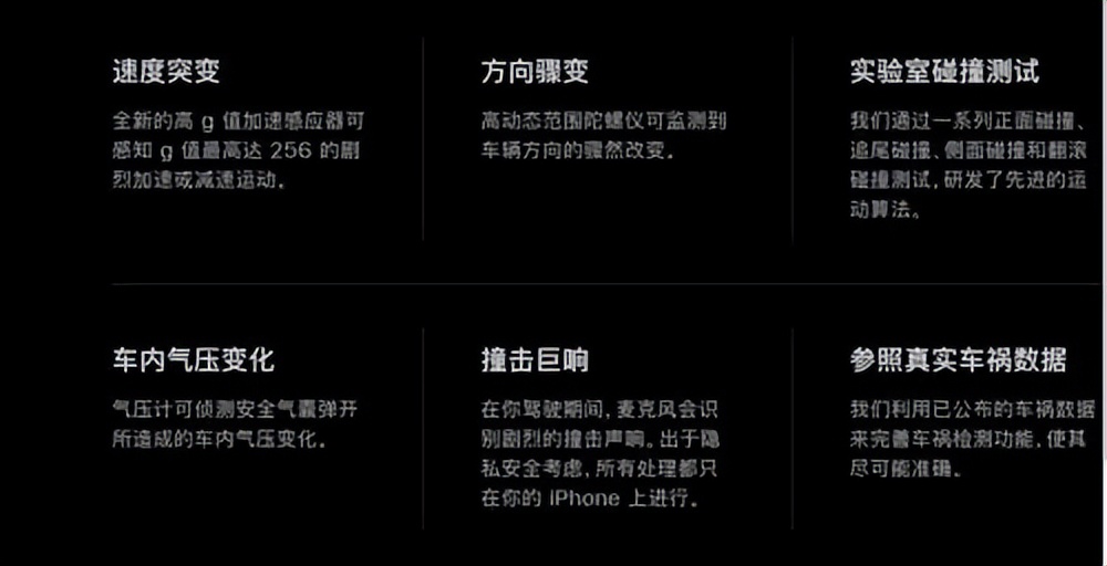iPhone14配备了新的双核加速度感应器和高动态范围陀螺仪,能够检测高达256Gs的剧烈加速或减速运动,一旦判断你遭遇严重车祸,会帮你呼救。