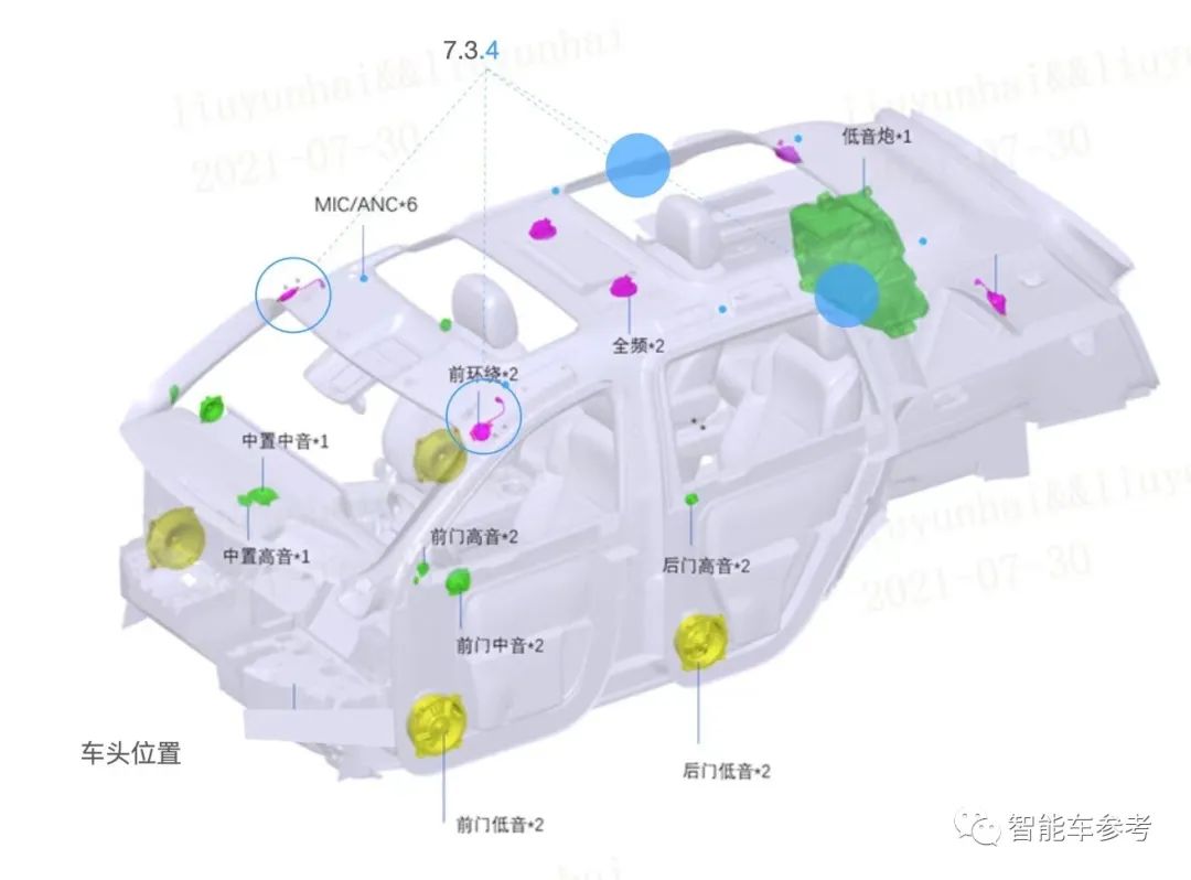 “4”指的是4个天空声道,分为前排左右天空声道(布置在A柱最上方)和后排左右天空声道(布置在C柱最上方),共4个全频扬声器。