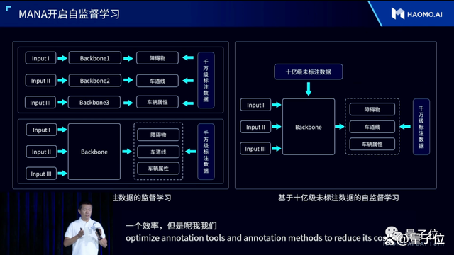 首先,数据标注。通过使用大规模量产车无标注数据的自监督学习方法,可以实现模型效果的有效提升,相比只用少量标注样本训练,训练效果提升3倍以上,可以更高效完成训练,更好适应感知需求。