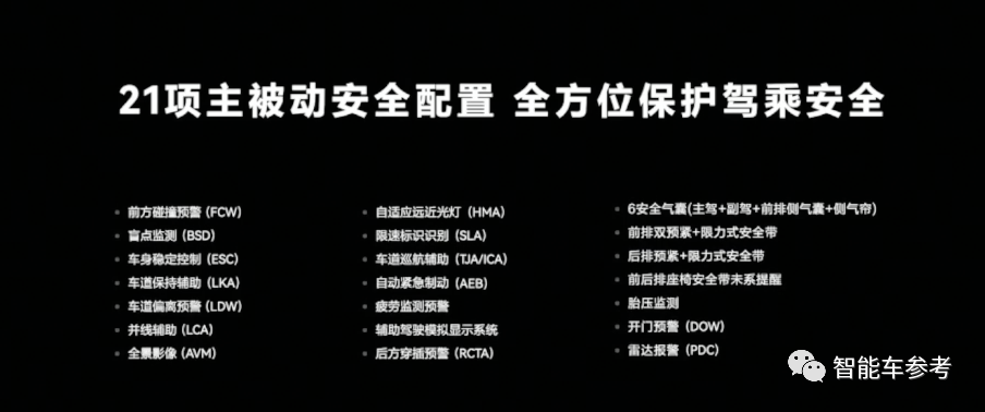 同时拥有21项主被动安全配置,包括碰撞预警、车道保持、车道偏离预警等等。