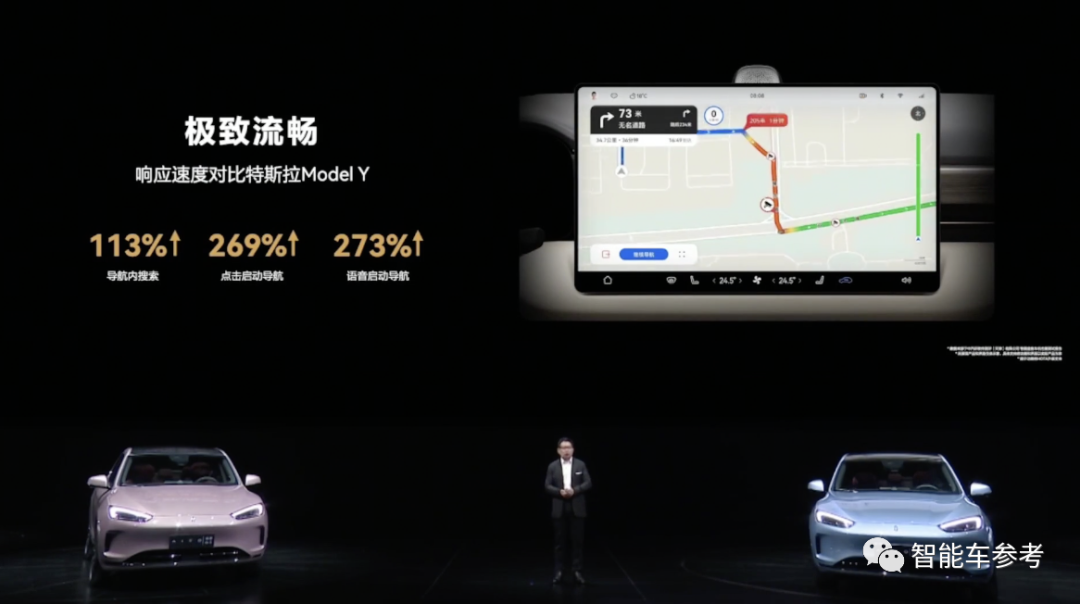 官方介绍称,在车机响应速度上远超特斯拉,具体体现在导航内搜索、点击启动导航、语音启动导航这三方面。
