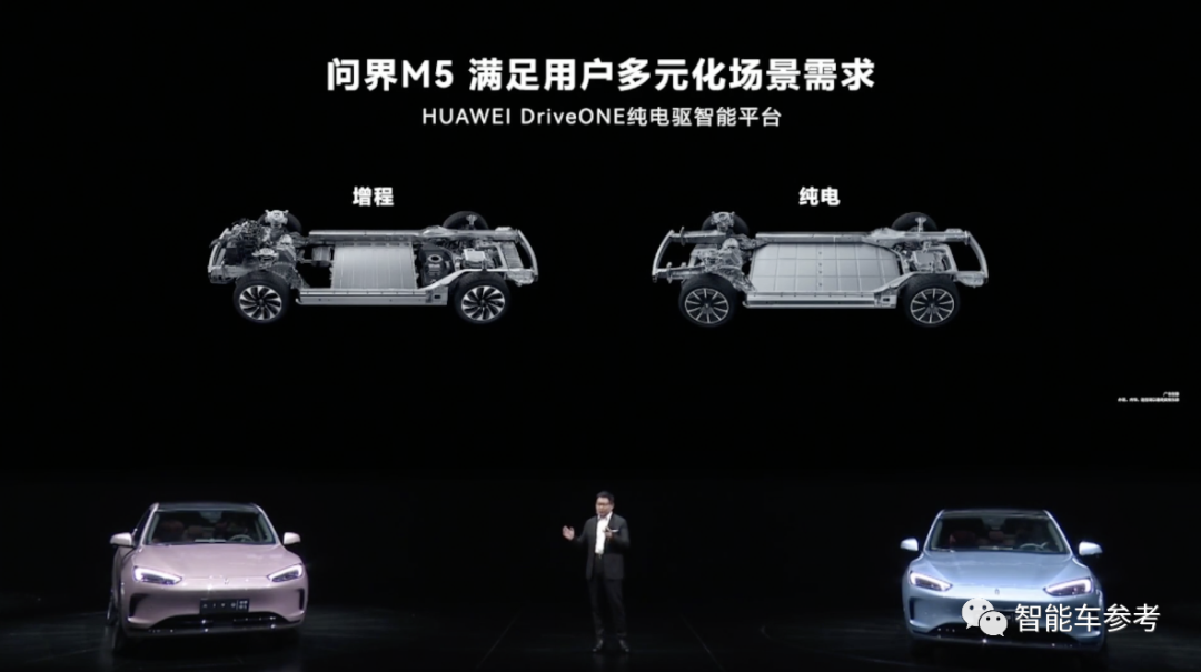搭载华为DriveONE纯电驱智能平台,余承东介绍时称与M5增程版搭载的电驱系统一样。