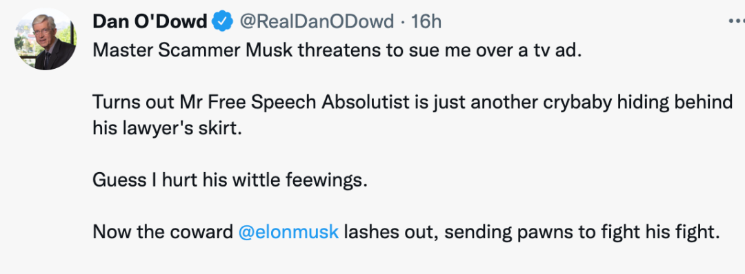 收到警告信后,他反应非常强烈,发推特指出,马斯克威胁说要起诉他。