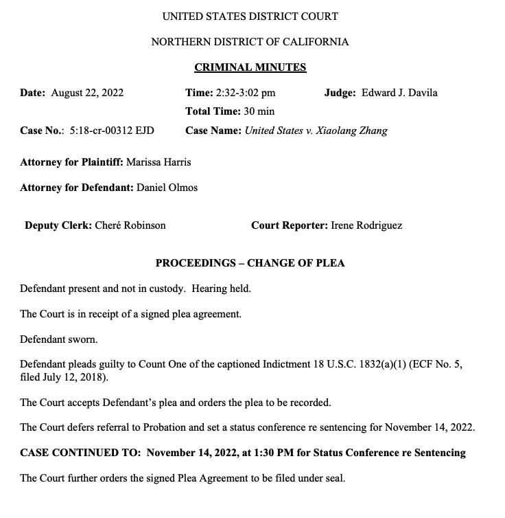 消息由加州圣何塞联邦法院的电子摘要披露,在当地时间周一举行的听证会上,张晓浪接受了窃取商业机密的指控,承认在跳槽小鹏汽车前窃取了苹果的自动驾驶商业机密。