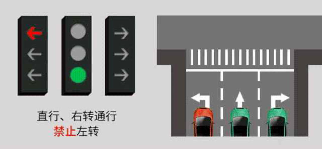 - 左转/掉头:首先看左侧的箭头灯,红灯停,绿灯行;如果不亮,就看中间圆形灯,只要绿色就走。