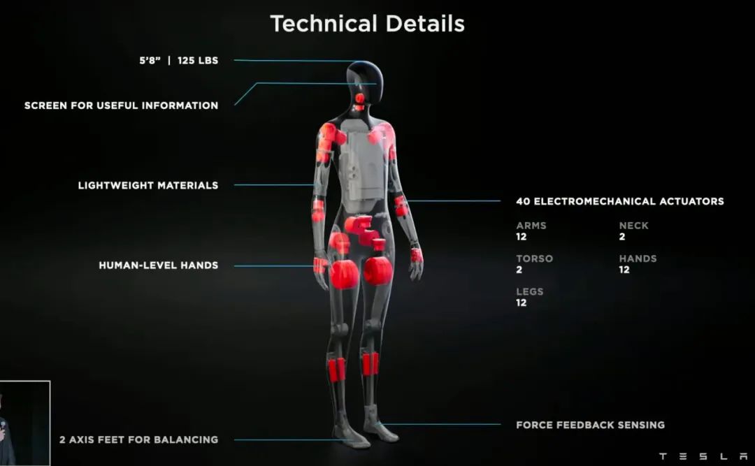 去年特斯拉推出通用人形机器人,与成人身高体重差不多,能够搬运重物、小步快走,正前方还有一块人机交互屏。