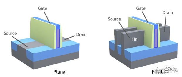 为了解决这个问题,先是英特尔在2011年,把鳍式场效晶体管用在了22nm节点上。通过伸出的“鳍”(fin),增大了沟道接触面积,大幅提高了栅极对通道内电场的控制能力。