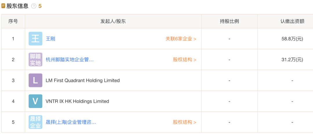 除了王刚,新生纪的股东构成中,还包括杭州脚踏实地企业管理合伙企业、LM First Quadrant Holding Limited、VNTR IX HK Holdings Limited、晟择(上海)企业管理咨询有限公司。