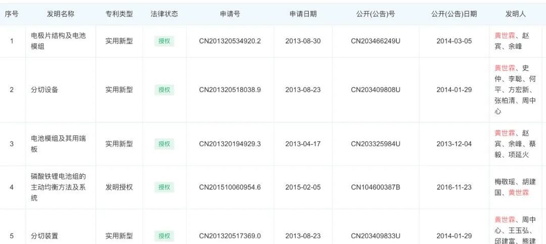 公开资料显示,黄世霖一共申请了21项锂离子电池相关专利,主要集中在2013年。