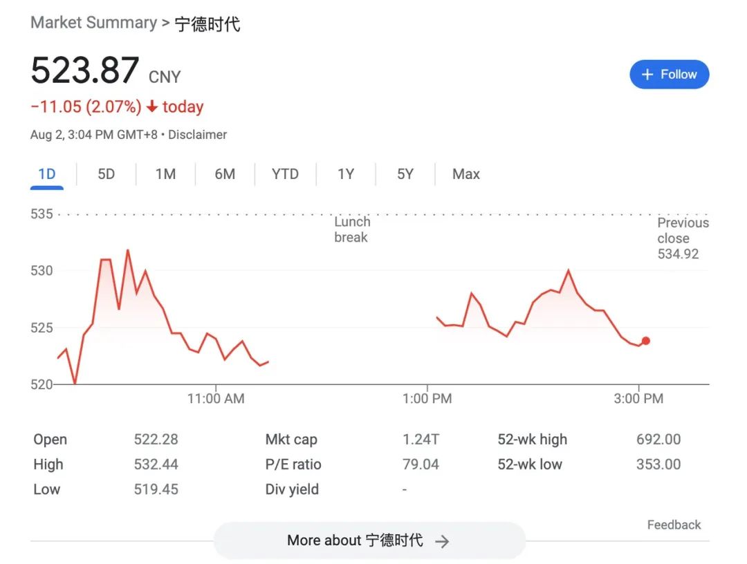 以及,截至8月2日,与消息披露当日收盘时相比,宁德时代股价已跌2.07%,市值蒸发269.7亿元。