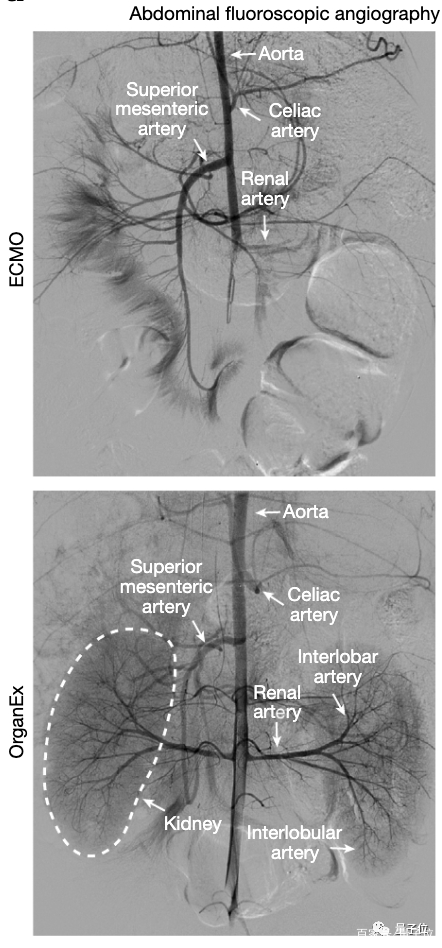 结果是OrganEx成功在小猪体内恢复了全身血液循环,各处动脉和器官(心脏、脑、肾和肝等)保持“充盈”状态,在ECMO则只能看到非常有限的此类现象。