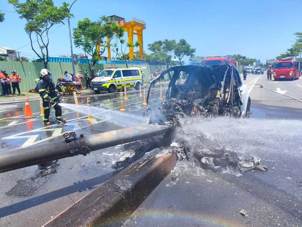 事发后,消防人员立即赶往现场扑灭火势,车头被烧得只剩骨架。