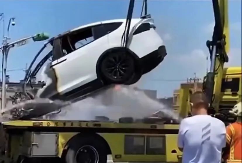 值得注意的是,这台车被拖吊起时又再次起火,现场人员只好不断洒水降温。