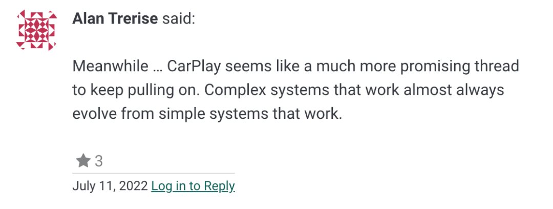 还有人认为“苹果CarPlay车机系统才更值得花心思投入,先把简单的搞好。”