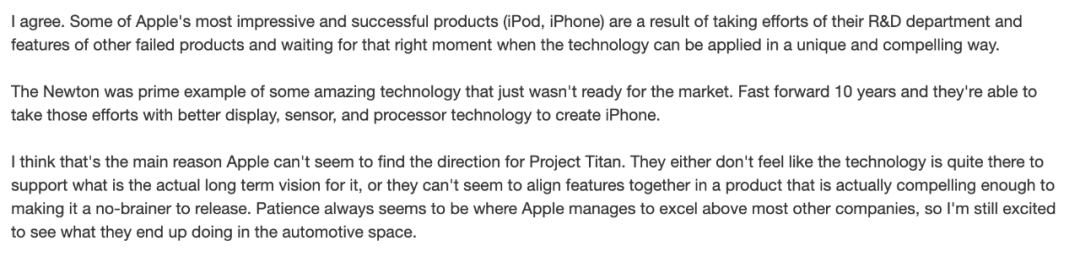 尽管如此,还是有网友愿意相信苹果:“苹果超过其他公司主要靠的是耐心,我还是很期待苹果造车。”