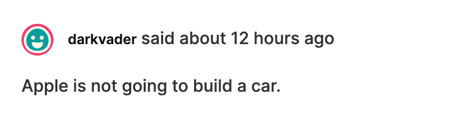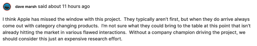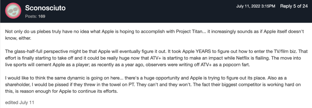 有人认为,“苹果造车,就像苹果进入电视/电影行业一样,花好几年时间摇摆不定,最终才找准自己的位置。”