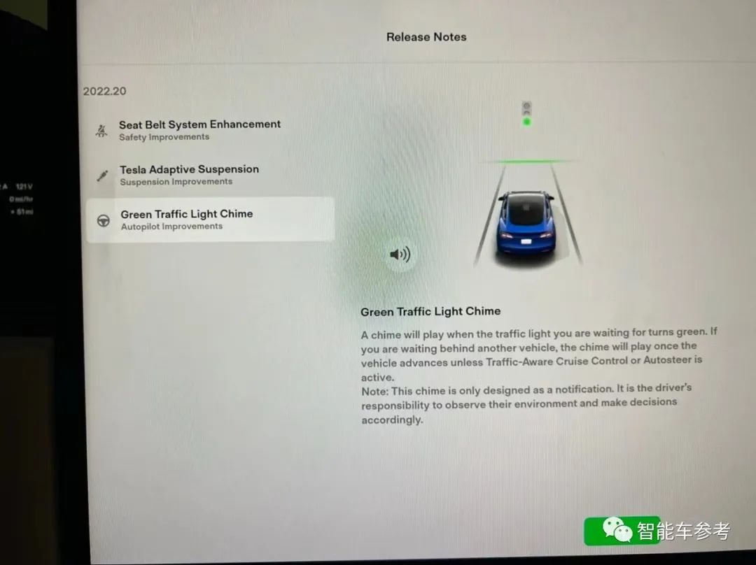 另一项是无需购买FSD,红灯变绿时,会有起步提示音。